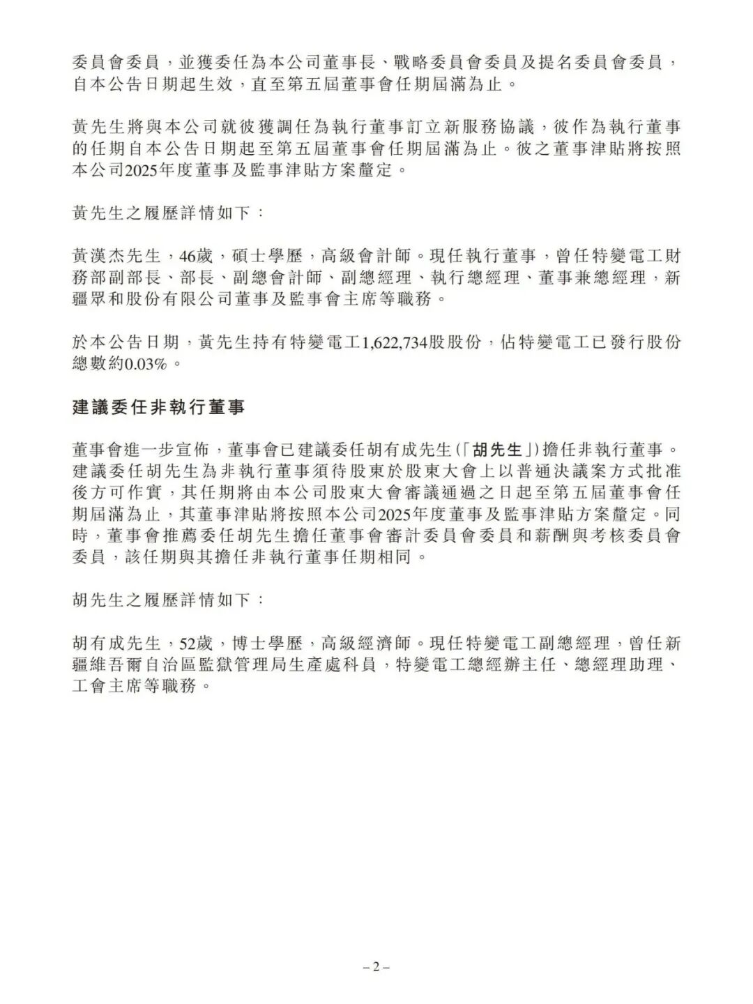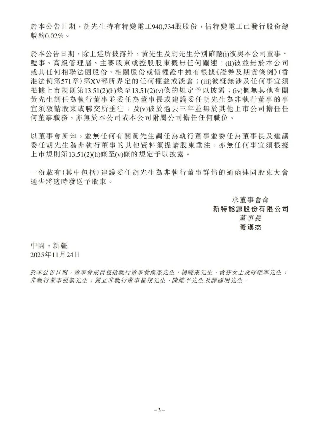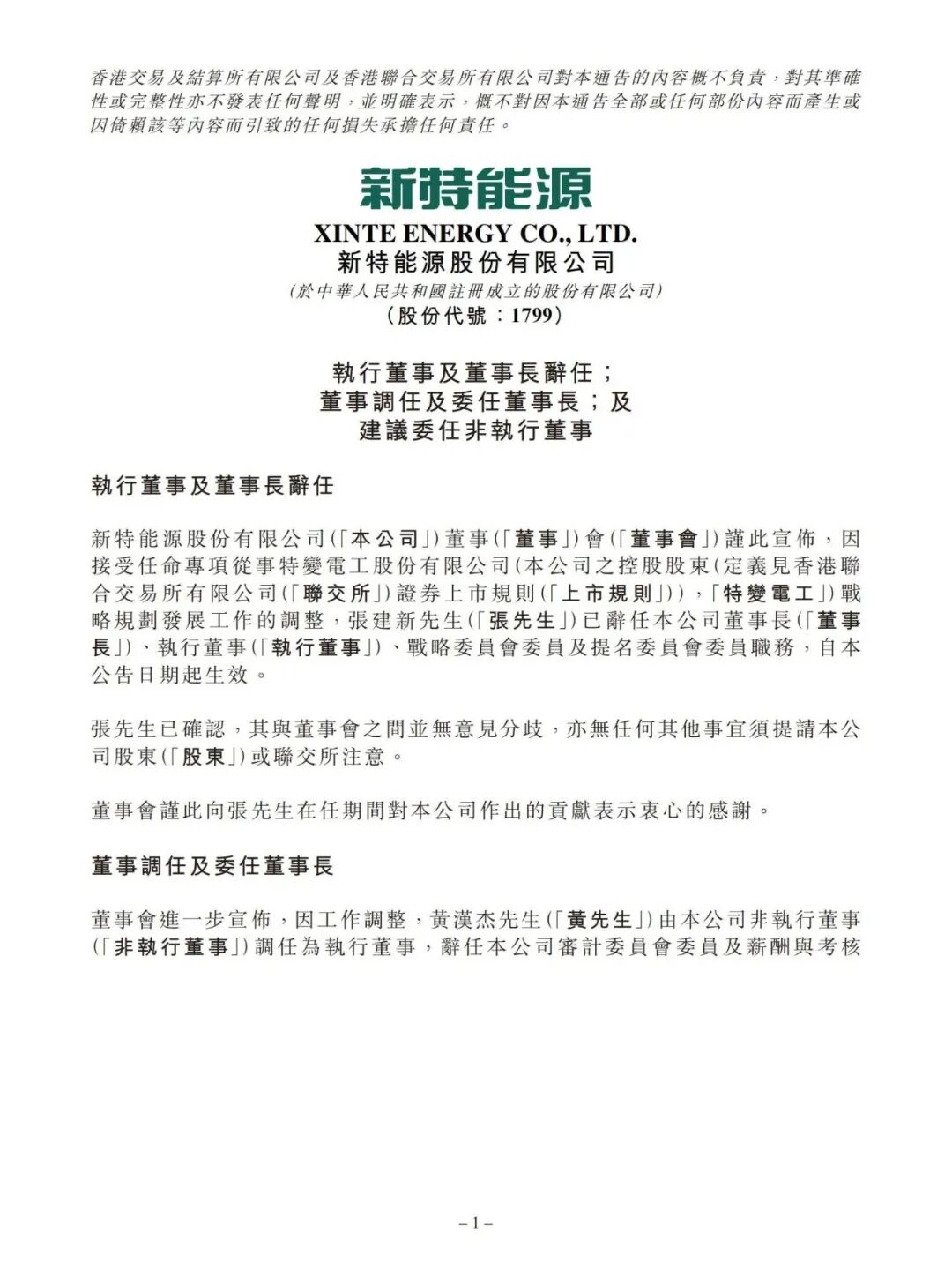 公告显示,因接受任命专项从事特变电工战略规划发展工作的调整,张建新已辞任新特能源董事长、执行董事、战略委员会委员及提名委员会委员职务,自本公告日期起生效。