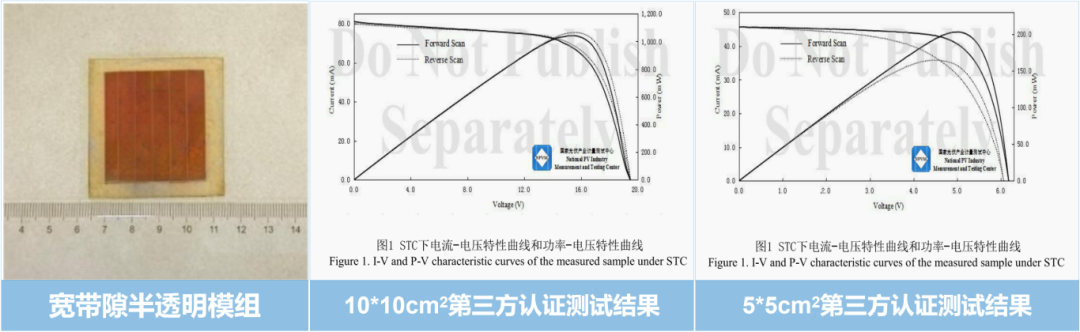 由浙大宁波理工学院与晶灵科技研究院联合研发的两款半透明钙钛矿电池,经认证,转换效率分别达到16.55%(小面积)与15.55%(100 cm²大面积,有效面积70.26 cm²),且平均透过率均保持在29.76%,光利用效率(LUE)最高达4.92%,刷新了宽带隙半透明钙钛矿领域的世界纪录。
